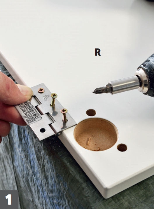 Bladhængsler monteres. Der er ikke plads til at bruge de fræsede beslag, der følger med til lågerne (R). Hængslerne skrues fast med 3,0 x 16 mm skruer.