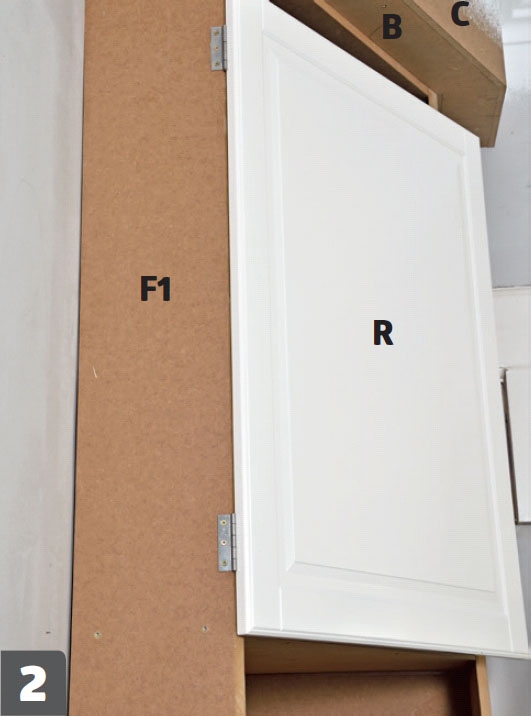 Lågerne (R) gøres fast til skabets ene side (F1). Her er den øverste låge på plads. Nederste låge monteres på samme måde.