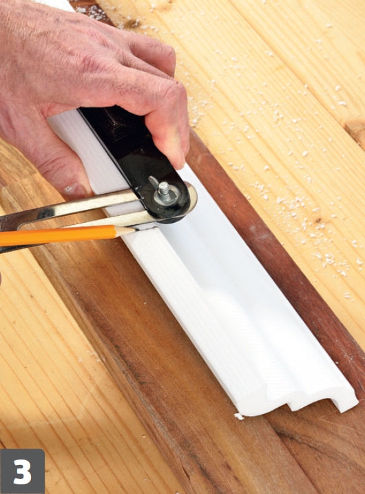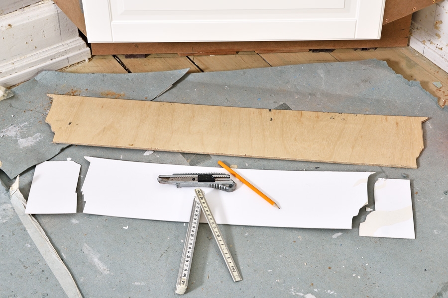 Bundstykket (K) skæres til. Tilpas et stykke pap i højde med soklen, og tegn faconen på de tilstødende fodlister af. Skær ud med en hobbykniv, og tegn af på bundlisten (K). Skær listen til med en stiksav.