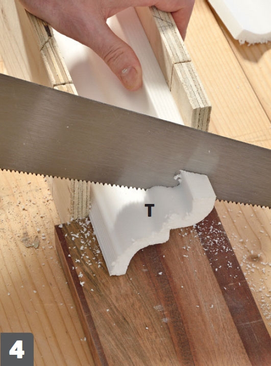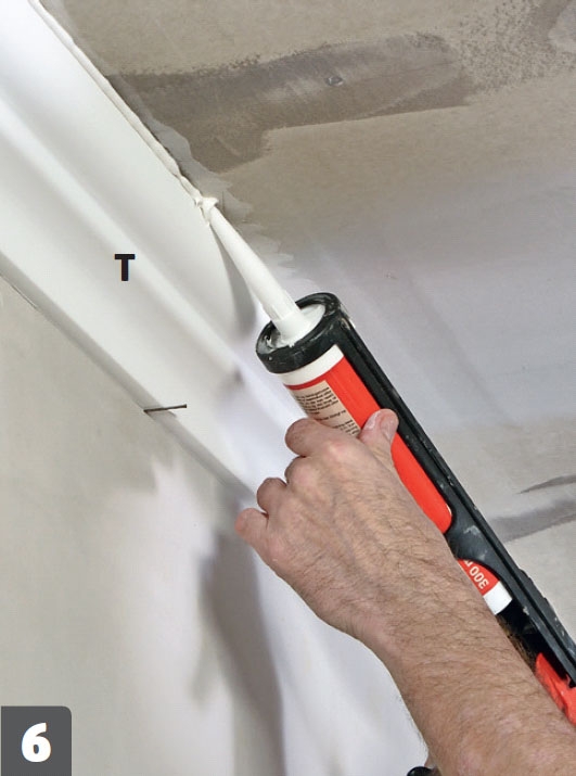 Stuklisten (T) limes fast til loftet. Smør stuklim på stukkens kanter, og tryk den på plads. Smør fugemasse på langs kanterne.