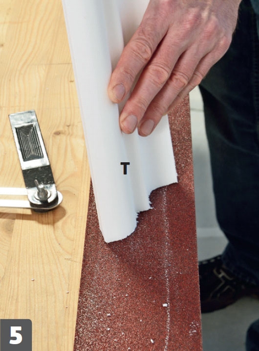 Den ru stuk (T) slibes. Med slibepapir i korn 120 slibes de ru kanter på stukken, inden den monteres.