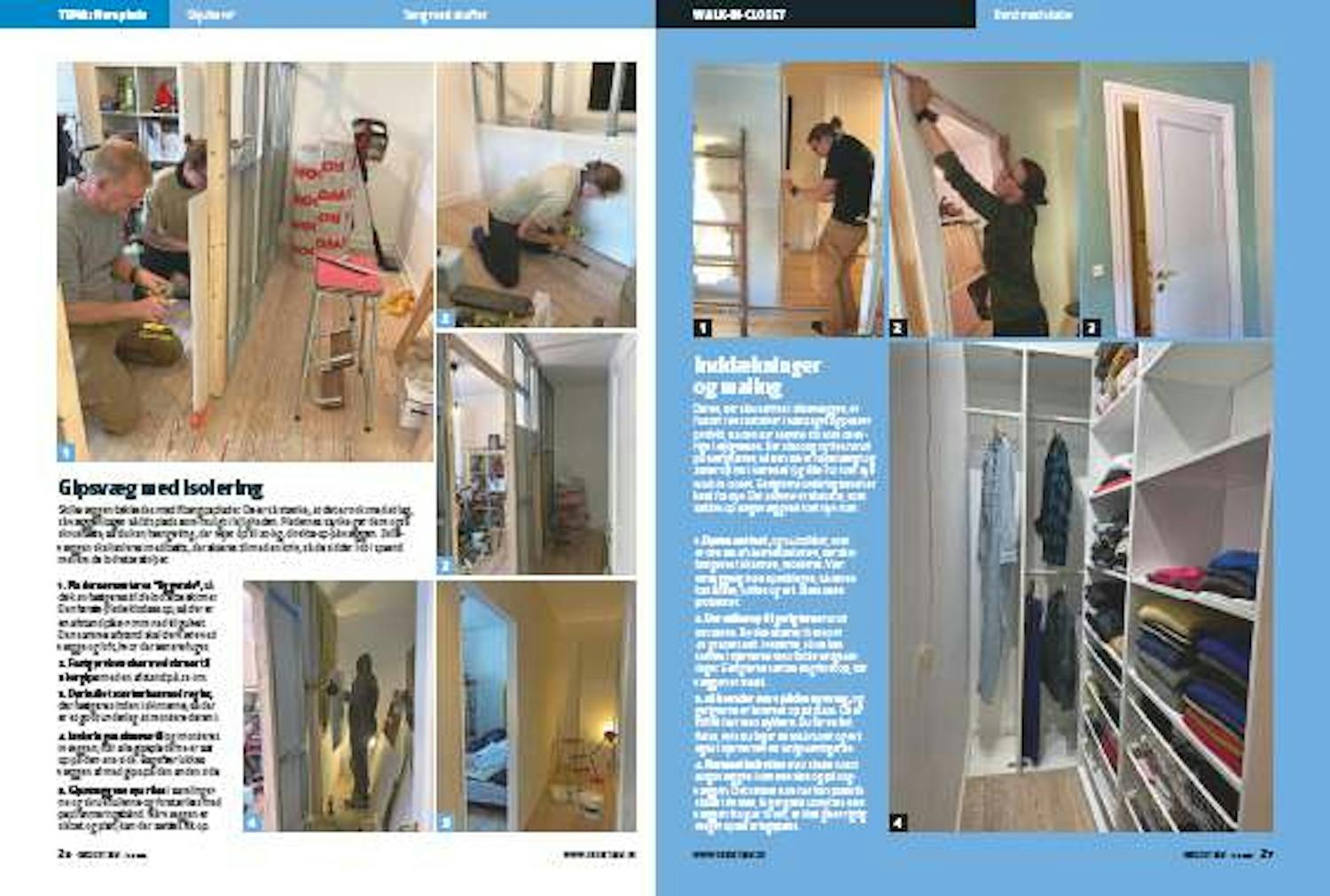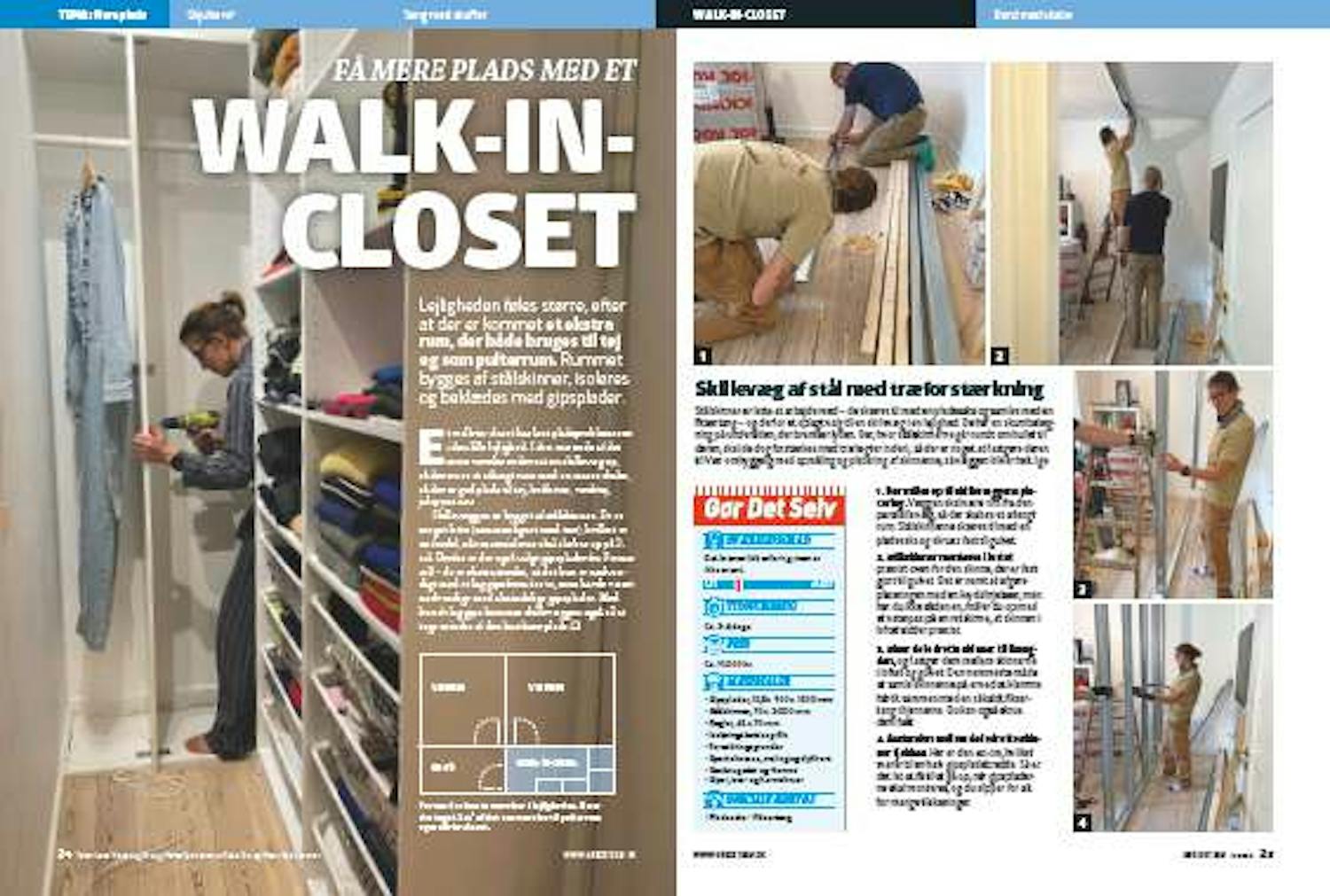 Døren, der skal sættes i skillevæggen, er fundet i en container i nabolaget og passer perfekt, da den har samme stil som de øvrige i lejligheden. Der skal dog byttes rundt på hængslerne, så den bliver højrehængt og åbner op ind i værelset (og ikke ind i det nye walk-in-closet. Gerigterne omkring døren er købt fra nye. Det samme er skabene, som sættes op langs væggene i det nye rum.