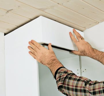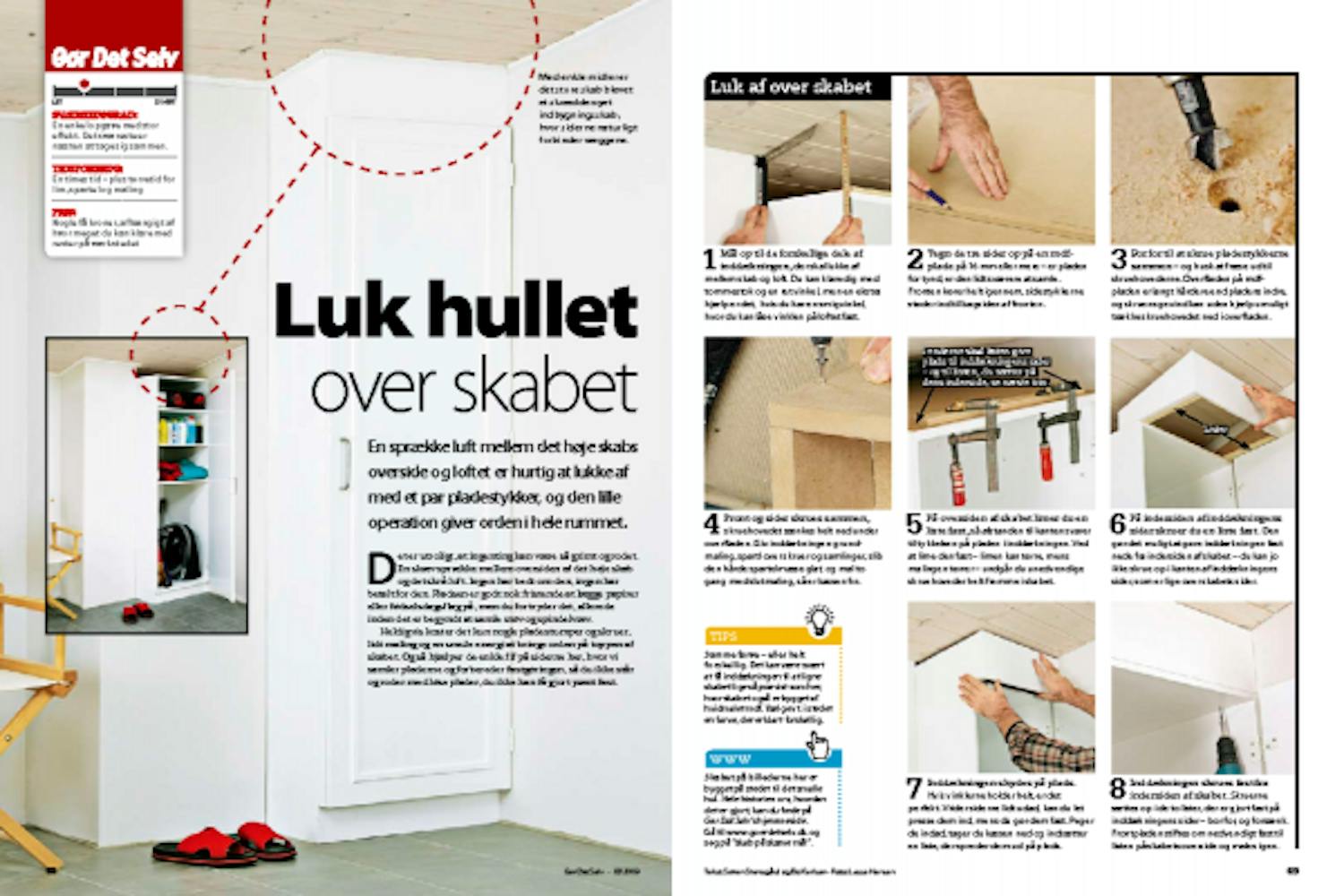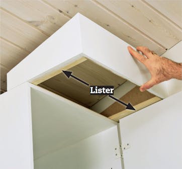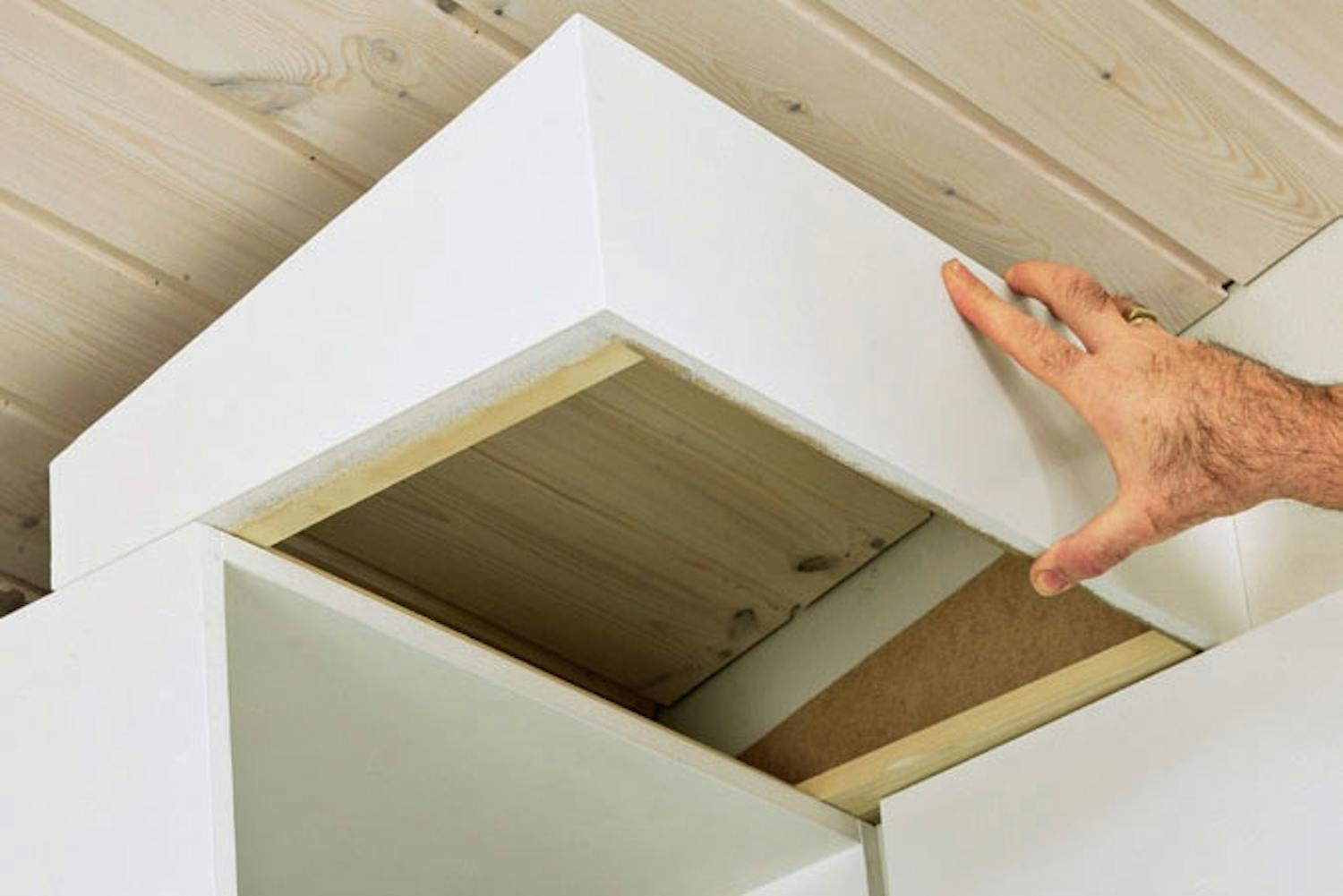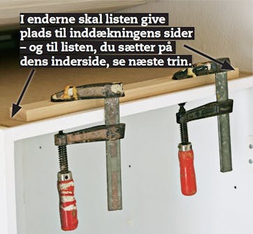 På oversiden af skabet limer du en liste fast, så afstanden til kanten svarer til tykkelsen på pladen i inddækningen. Ved at lime den fast - limen kan tørre, mens malingen tørrer - undgår du unødvendige skruehoveder helt fremme i skabet.