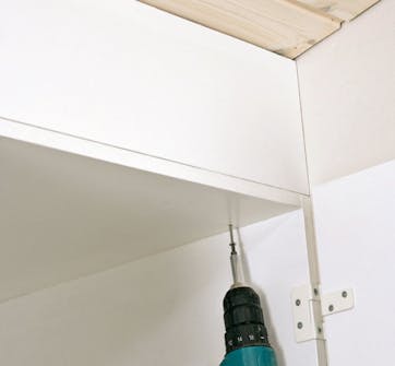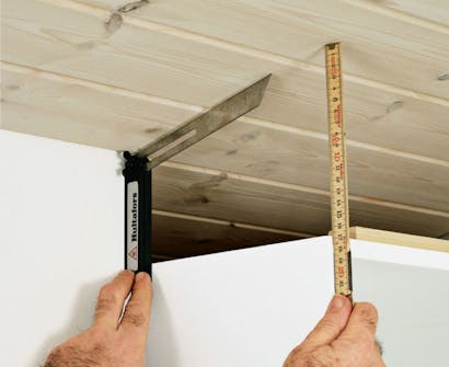 Mål op til de forskellige dele af inddækningen, der skal lukke af mellem skab og loft. Du kan klare dig med tommestok og en ret vinkel, men en ekstra hjælp er det, hvis du har en smigvinkel, hvor du kan låse vinklen på loftet fast.