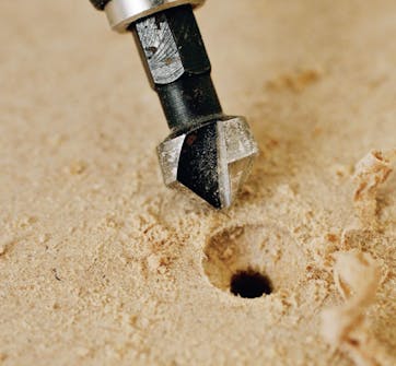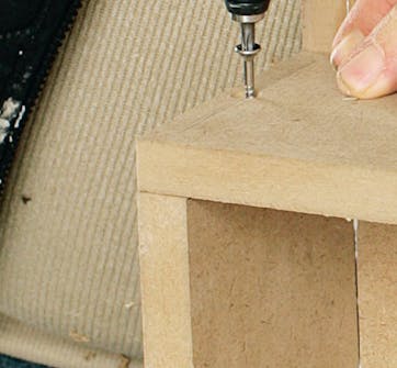 Bor for til at skrue pladestykkerne sammen - og husk at fræse ud til skruehovederne. Overfladen på mdf-pladen er langt hårdere end pladens indre, og skruens gevind kan uden hjælp umuligt trække skruehovedet ned i overfladen.