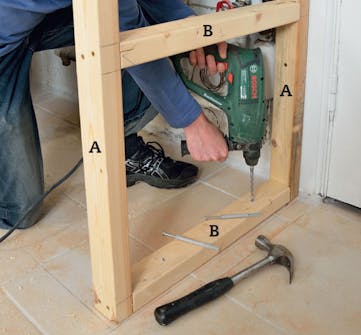 De lodrette stolper (A) samles med nederste og øverste tværstiver (B). Her starter vi med den nederste. De fastgøres med 5 x 80 mm skruer. Den øverste tværstiver skal her placeres to reglartykkelser nede på forreste stolpe, så der er plads til rør.