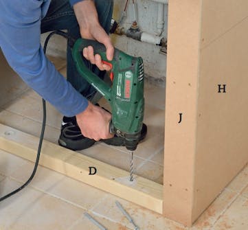 Skær en MDF-plade (H) til, og skru den fast på ydersiden. Hold den på plads med tvinger, mens den skrues fast med 4 x 40 mm skruer. Her er det nødvendigt at skære pladen til foroven, så den passer omkring rørene. Se nederst, hvordan du gør.