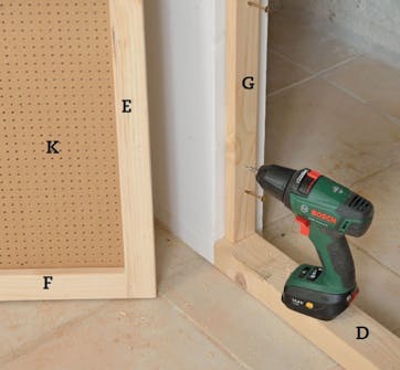 Lodrette lister (E) og vandrette lister (F) samles med trælim og 5 x 70 mm skruer. Når du måler op til døren, skal du huske at beregne ca. 0,5 cm’s luft i begge sider af døren. Tjek, om den passer perfekt til dørhullet.