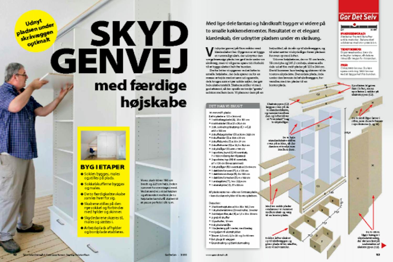 Oven på skabene opstår der et brugbart rum. Det lukkes af med to skydelåger, hvor den venstre afsaves, så den passer ind mod den skrå væg.
