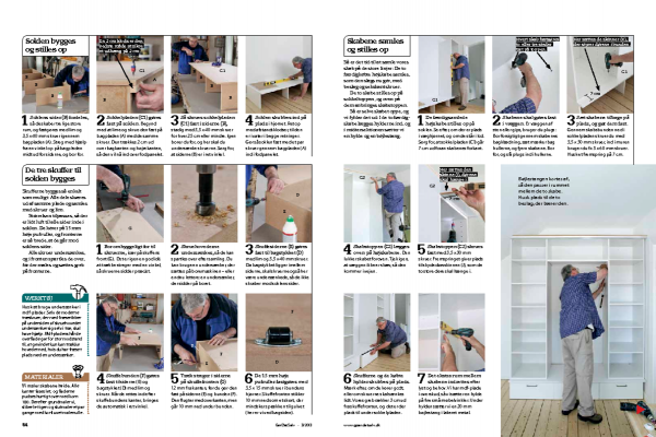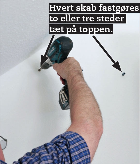 Sæt skabene tilbage på plads, og gør dem fast. Gennem skabsbunden ned i sokkelpladen skruer du med 3,5 x 30 mm skruer, ind i muren bruger du fx 5 x 60 mm skruer. Husk et fremspring på 7 cm.