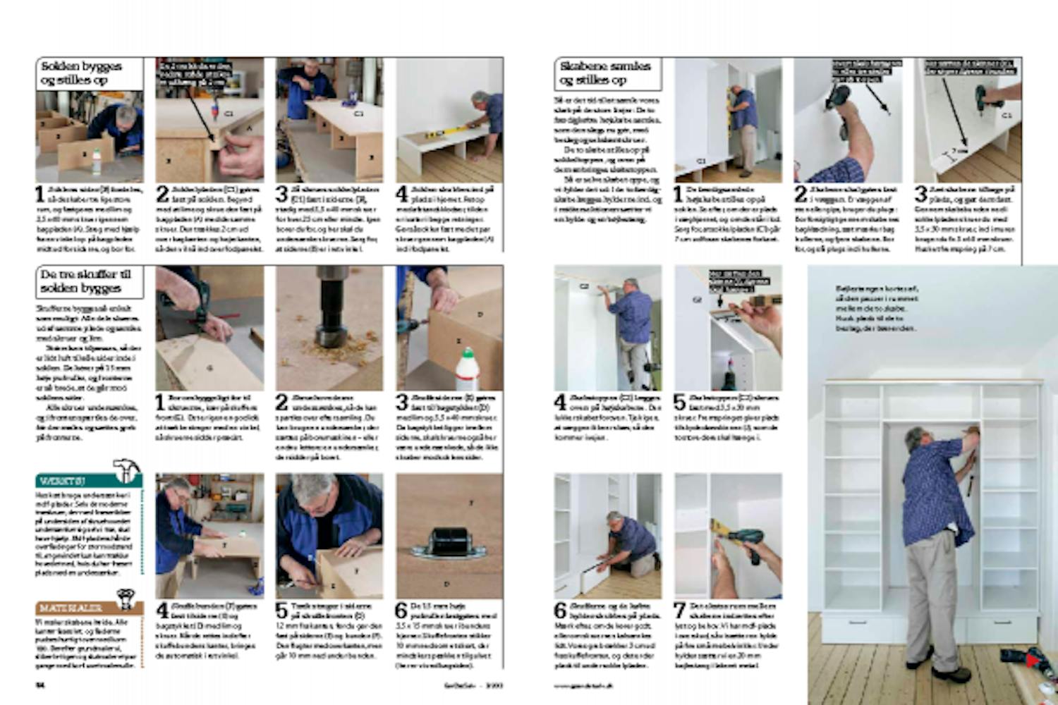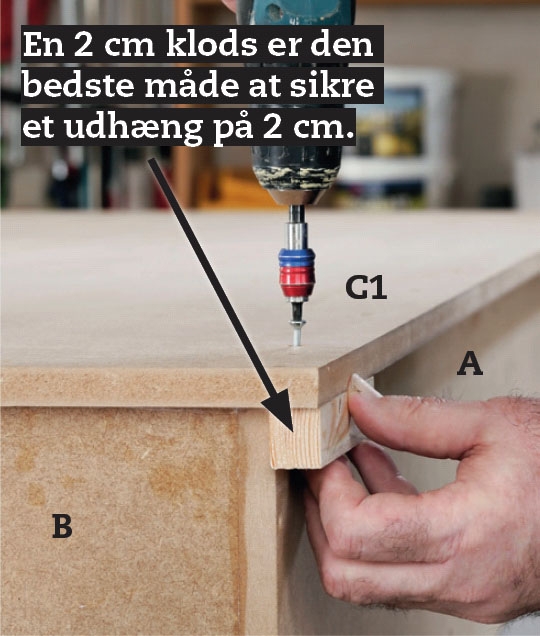 Bor omhyggeligt for til skruerne, især på skuffens front (G). Det er igen en god idé at trække streger med en vinkel, så skruerne sidder præcist.