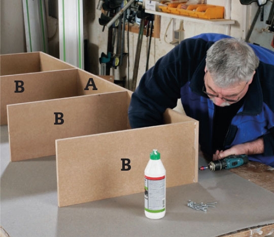 Soklens sider (B) fordeles, så de skaber tre lige store rum, og fastgøres med lim og 3,5 x 40 mm skruer igennem bagpladen (A). Streg med hjælp fra en vinkel op på bagpladen midt ud for siderne, og bor for.