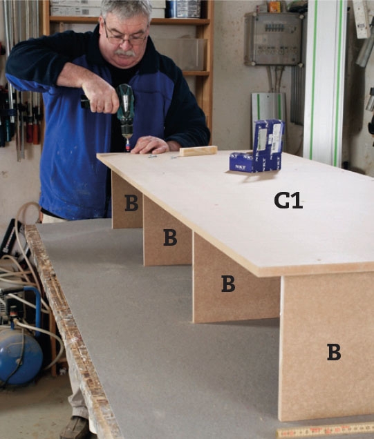 Så skrues sokkelpladen (C1) fast i siderne (B), stadig med 3,5 x 40 mm skruer for hver 25 cm eller mindre. Igen borer du for, og her skal du undersænke skruerne. Sørg for, at siderne (B) er i ret vinkel.