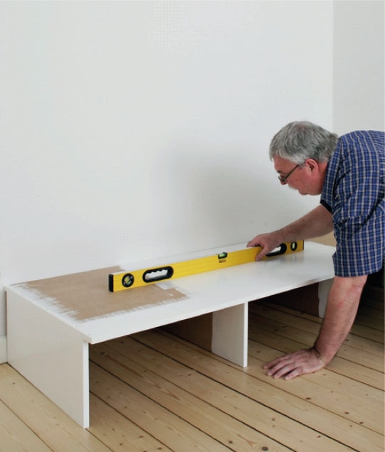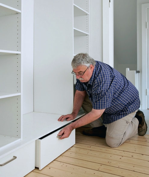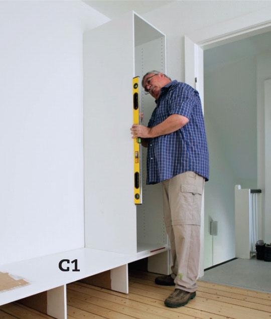 De færdigsamlede højskabe stilles op på soklen. Se efter, om der er plads i væghjørnet, og om de står i lod. Sørg for, at sokkelpladen (C1) går 7 cm ud foran skabenes forkant.