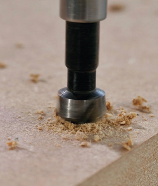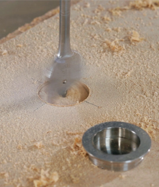 Lågerne forsynes med skydedørsskåle, der sænkes ned i dem - almindelige greb vil være i vejen, når lågerne skydes forbi hinanden. Skålene limes fast i 8 mm dybe huller, vi borer med et 40 mm spadebor.