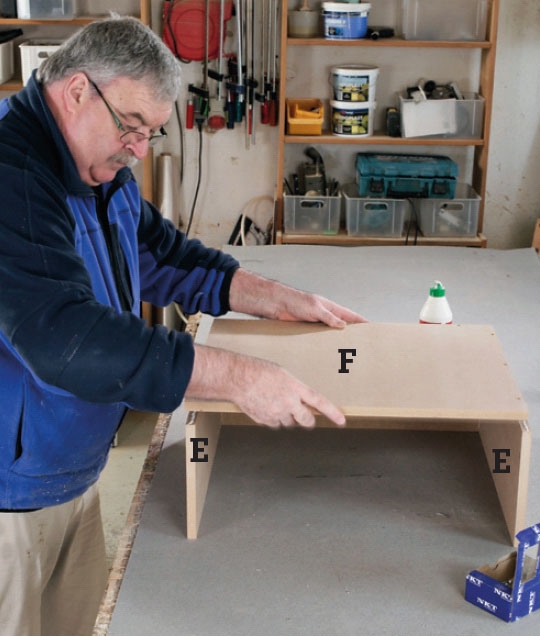 Skuffebunden (F) gøres fast til siderne (E) og bagstykket (D) med lim og skruer. Når de rettes ind efter skuffebundens kanter, bringes de automatisk i ret vinkel.