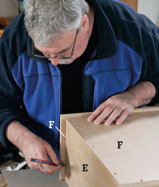 Træk streger i siderne på skuffefronten (G) 12 mm fra kanten, før du gør den fast på siderne (E) og bunden (F). Den flugter med overkanten, men går 10 mm ned under bunden.