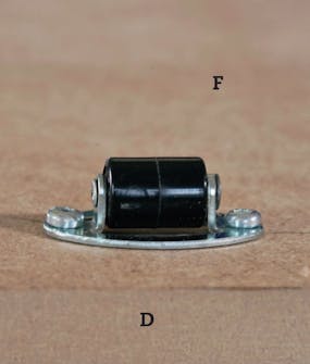 I bunden af lågerne fræses en rille, der skal gribe ned i styreskinnen (K). Slidsen er 4 mm bred og 12 mm dyb. I toppen skrues rullerne fast på lågernes bagside med de tilhørende korte skruer.