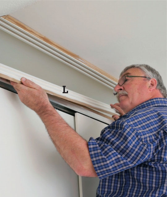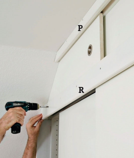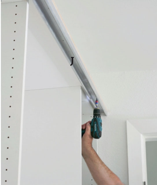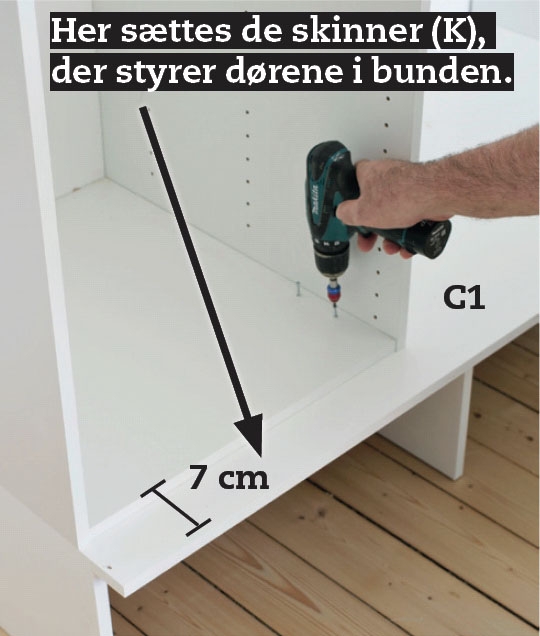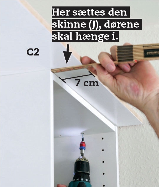 Skabstoppen (C2) skrues fast med 3,5 x 30 mm skruer. Fremspringet giver plads til skydedørsskinnen (J), som de to store døre skal hænge i.