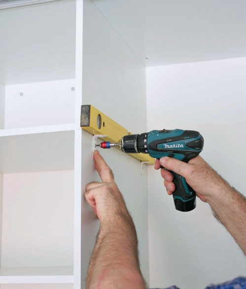 Skabene skal gøres fast i væggen. Er væggen af sten eller gips, bruger du plugs: Bor forsigtigt gennem skabenes bagklædning, sæt mærker bag hullerne, og fjern skabene. Bor for, og slå plugs ind i hullerne.