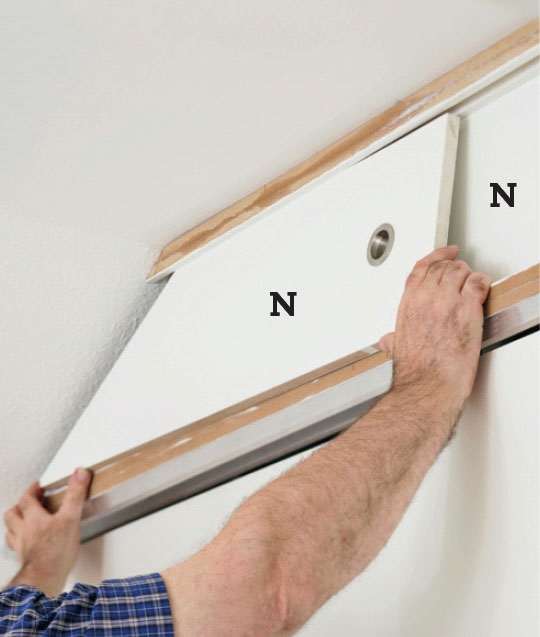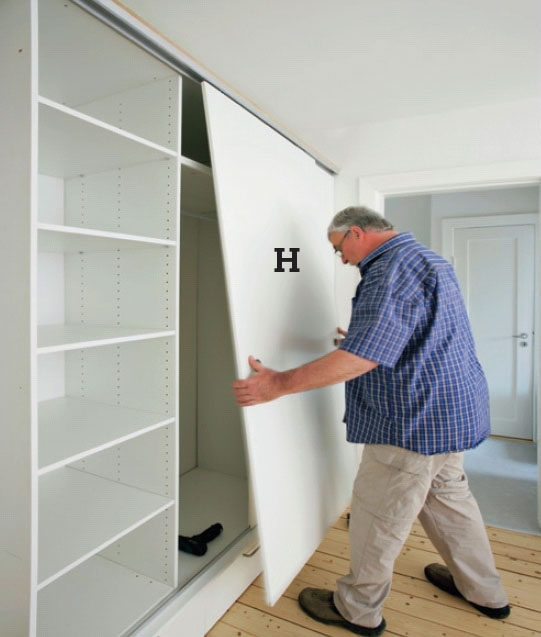 Lågerne (n) løftes på plads, efter at den forreste er tilpasset med et skråt snit i siden. Når alle låger er lukkede, skal den forreste låge tilpasses, så dens lige side ligger i flugt med klædeskabets skydelåge.