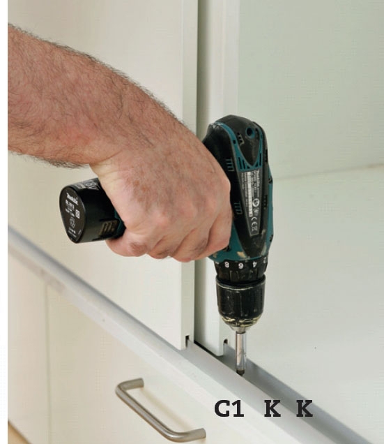 Styreskinnerne (K) gøres fast på sokkelpladen (C1), efter at de er skubbet op i slidsen på skydelågerne. Lågernes front bringes i lod, og skinnerne skrues fast med 3,5 x 15 mm panhovedede skruer pr. 25 cm.