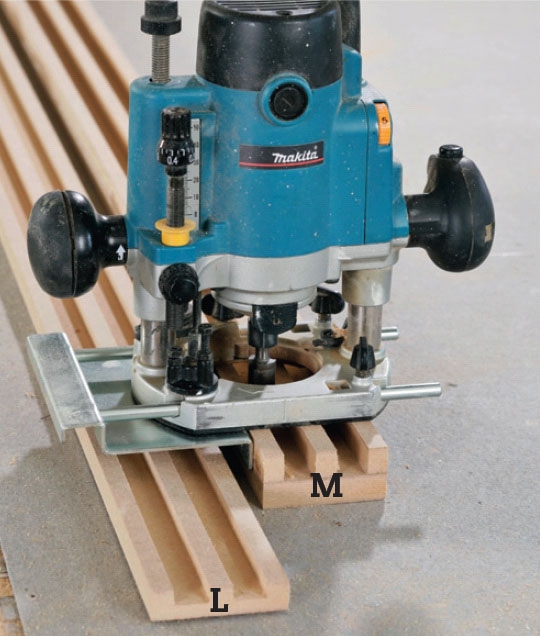 I sporlisterne (L og M) fræses spor med et 18 mm notjern 1 cm fra begge sider. I den øverste liste (M), der består af to sammenlimede lister, er sporet 20 mm dybt. I den nederste (L) er det 8 mm dybt.