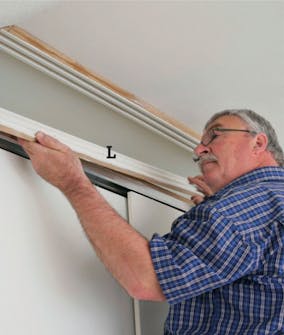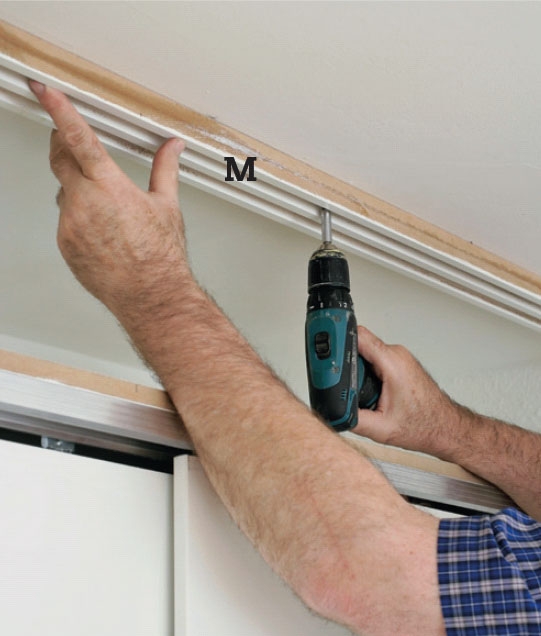 Øverste skydeliste (M) skrues fast i loftet, efter at den er tilpasset i længden med et skråt snit, så den passer under væggen. Forkant af listen skal ligge i plan med forkanten af overpladen (C2).