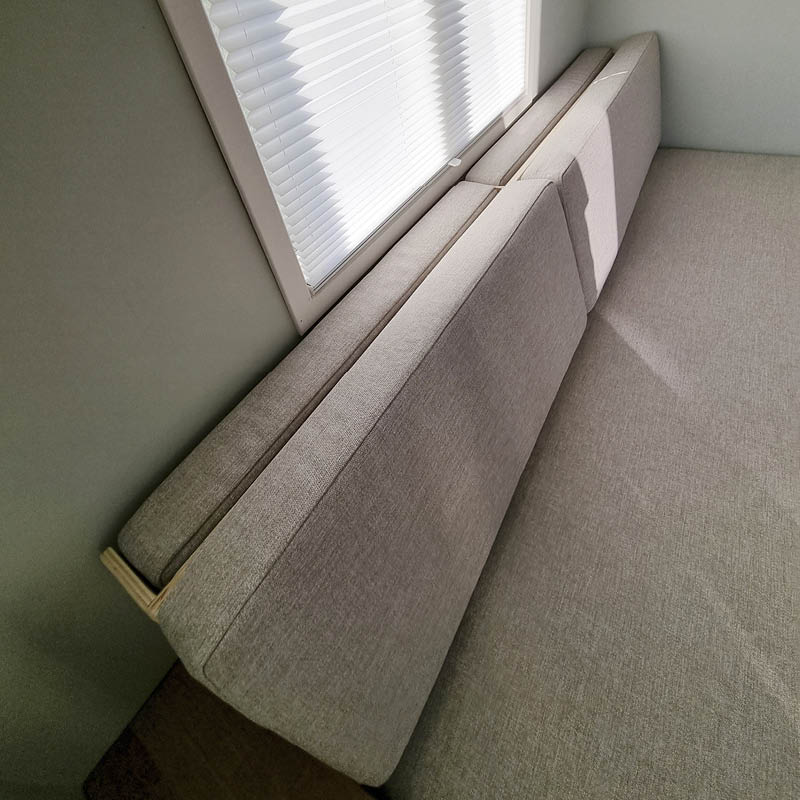 Ryglænet skjuler ekstra hynder. Når sofaen trækkes ud, skal der selvfølgelig bruges ekstra hynder. Derfor er ryglænet bygget som en skal, der kan skjule to ekstra hynder.