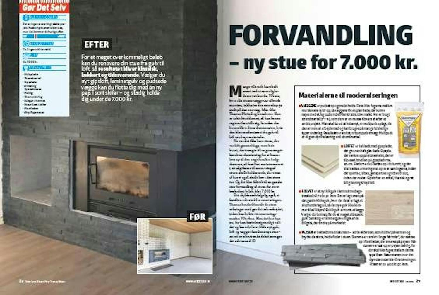 PEJSEN er beklædt med natursten - sorte skifersten, som holder på varmen og bryder de store, hvide flader i stuen. Stenene er samlet i lange “strimler”, der sættes op i fliseklæber, der smøres på pejsen. Når stenene er sat op, er pejsen færdig, for der skal ikke fuges mellem denne type fliser. Naturstenene var det dyreste materiale til renoveringen. Prisen er ca. 400 kr. pr. kvm.