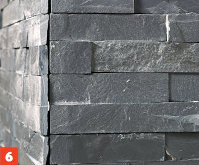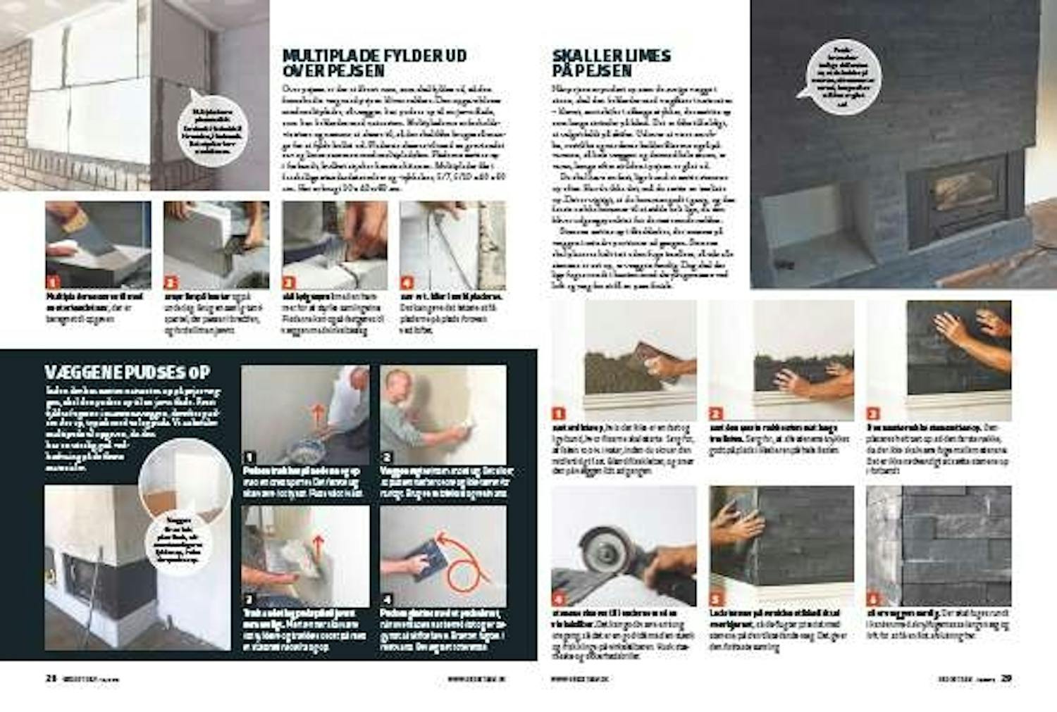 Når pejsen er pudset op som de øvrige vægge i stuen, skal den beklædes med vægfliser i natursten - kløvet, sort skifer i aflange stykker, der sættes op som lange strimler på bånd. Det er ikke tilfældigt, at valget faldt på skifer. Ud over at være smuk-ke, rustikke og moderne holder fliserne også på varmen, så hele væggen og dermed hele stuen, er varm, længe efter at ilden i pejsen er gået ud.