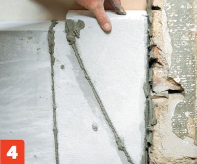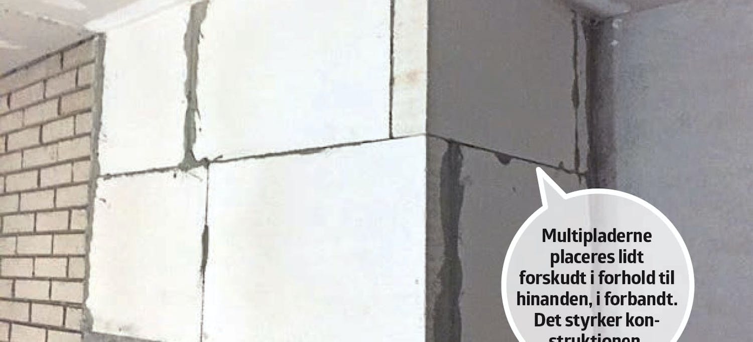 Over pejsen er der et åbent rum, som skal fyldes ud, så den fremskudte væg med pejsen bliver enklere. Den opgave klares med multiplader, så væggen kan pudses op til en jævn flade, som kan beklædes med natursten. Multipladerne er forholdsvis store og nemme at skære til, så der skal ikke bruges så mange for at fylde hullet ud. Pladerne skæres til med en grovtandet sav og limes sammen med multipladelim. Pladerne sættes op i forbandt, hvilket styrker konstruktionen. Multiplader fås i forskellige standardstørrelser og -tykkelser, 5/7, 5/10 x 40 x 60 cm. Her er brugt 10 x 40 x 60 cm.