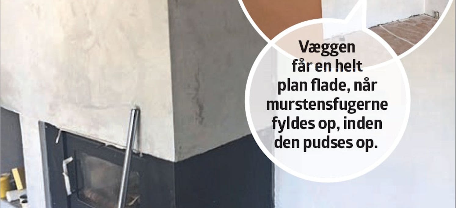 VÆGGENE er pudset op og malet hvide. Først blev fugerne mellem murstenene fyldt op, så væggene fik en plan flade, der kunne nøjes med et lag puds, inden den til sidst blev malet. Her er brugt strandmørtel (7/7 %), som der var en masse tilovers af efter et andet projekt. Men skal du ud at købe nyt, er multipuds oplagt, da den er nem at arbejde med og kan bruges på mange forskellige typer underlag. Resultatet er en flot, robust pudset væg. Multipuds er dog en dyrere løsning end strandmørtel.
