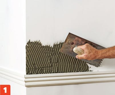 Sæt en liste op,hvis der ikke er en fast og lige bund, hvor fliserne skal starte. Sørg for, at listen 100 % i vater, inden du skruer den midlertidigt fast. Bland fliseklæber, og smør den på væggen lidt ad gangen.