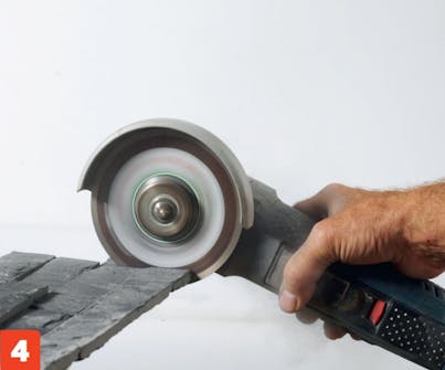 Stenene skæres til i enderne med en vinkelsliber. Det kan godt være en tung omgang, så det er en god idé med en stærk og frisk klinge på vinkelsliberen. Husk støvmaske og sikkerhedsbriller.