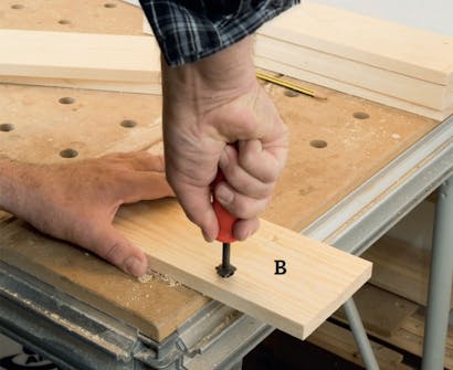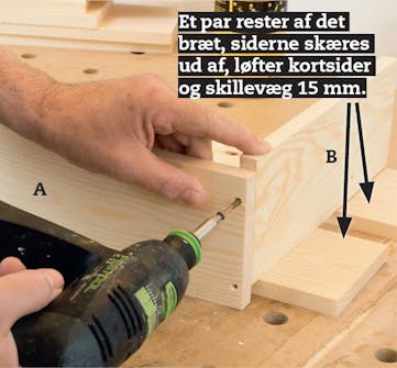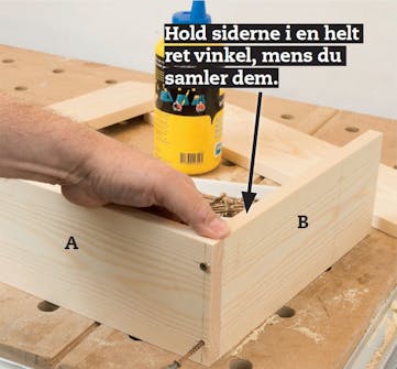 Siderne (A og B) og skillevæggen (C) samles med lim og 4 x 50 mm skruer. Spænd efter i hånden - du er tæt på kanten, og træet flækker let. Bor evt. for i endetræet med et 2 mm bor, så er risikoen mindst.