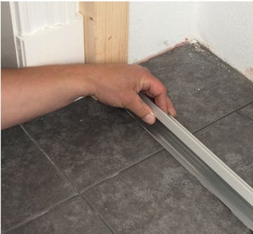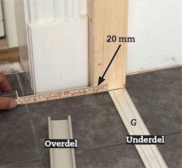 Mål 20 mm ind, og mærk op til placering af bundskinnen. Den består af en underdel, som gøres fast på gulvet med dobbeltklæbende skumtape, og en overdel, som klikkes på.