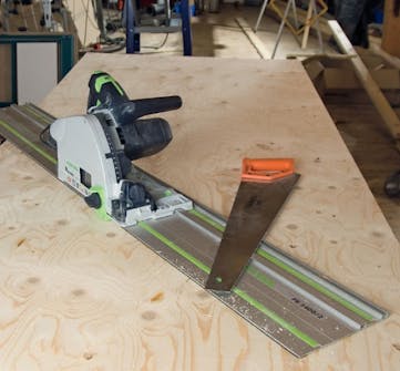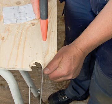 Start med at save de to døre ud. Vi har lavet dørene af 13 mm krydsfiner, som vi savede ud med en dyksav med føringsskinne. Du kan også save dem ud med en almindelig rundsav.