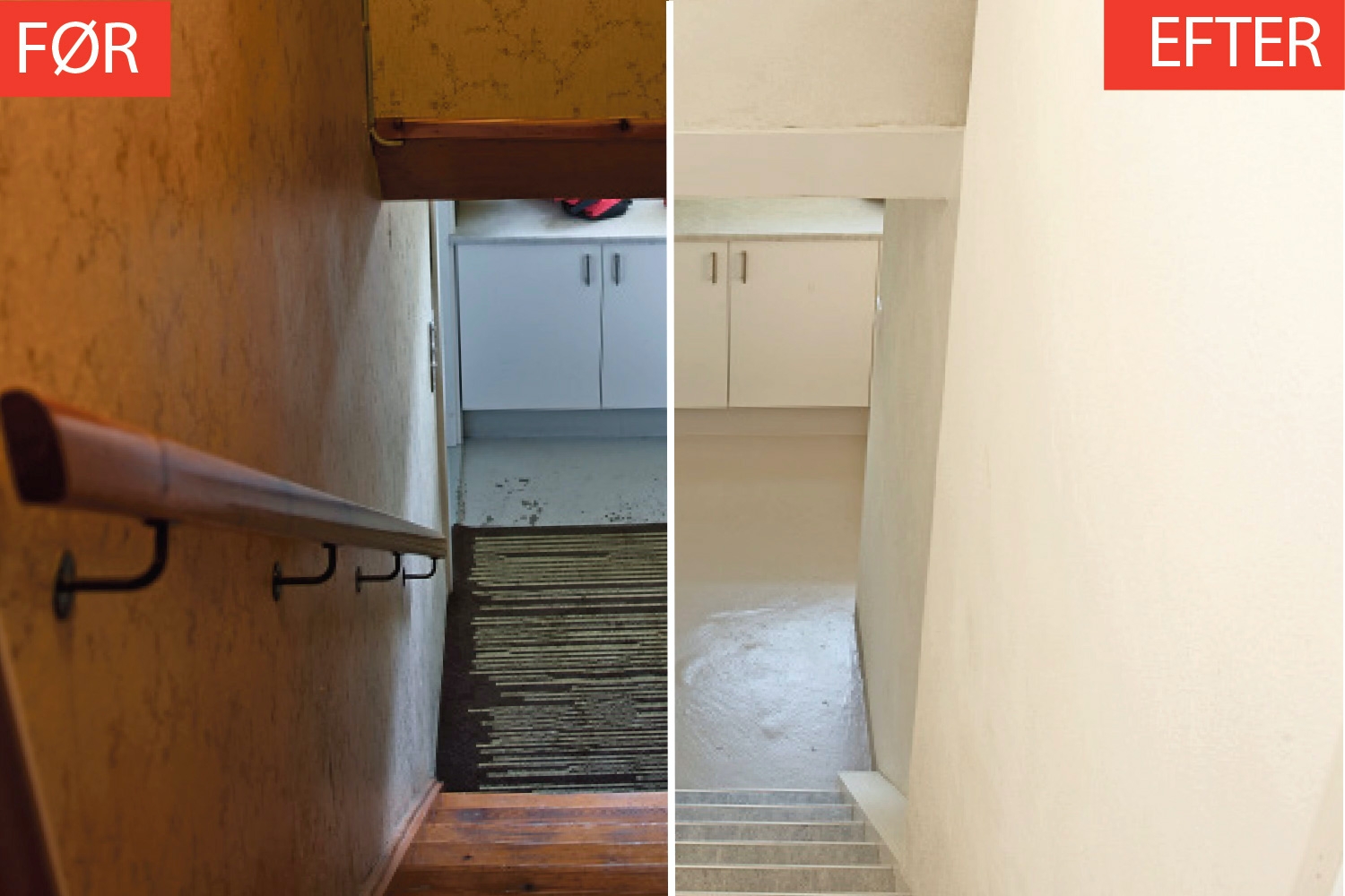 Vi giver alle de lodrette flader en hvid fiberforstærket puds, som kan klæbe på stort set alle underlag, og som kan klare sig uden maling. Det betyder et helt nyt og moderne look og får trapperummet til at se væsentlig lysere ud.