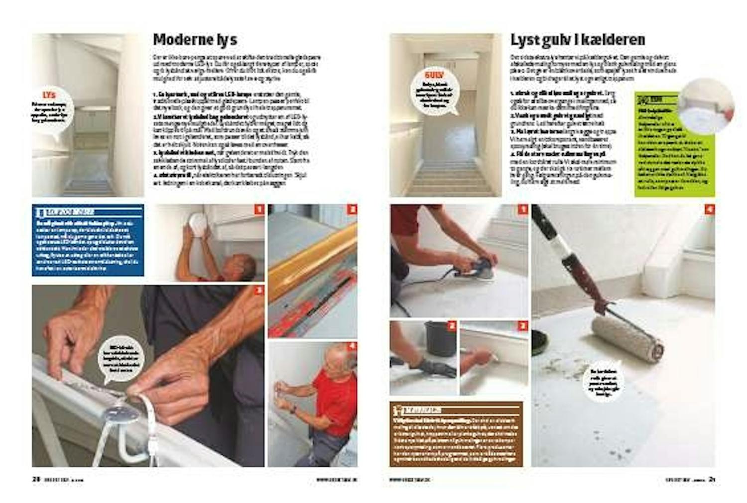 Det sidste ekstra lys henter vi på kældergulvet. Den gamle og delvist afskallede maling fornyes med en lys og blank gulvmaling med en glans på 80. Det giver en blank overflade, som spejler lyset fra et vindue nede kælderen og bidrager til et lyst og venligt trapperum.