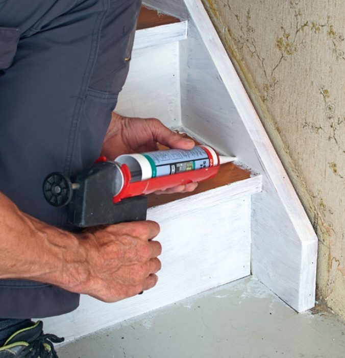 - 1 patron hvid gummifuge, som kan males (ikke akryl) 12 m alu-trappeforkant til 3 mm beklædning 3 m2 linoleum (3 mm)