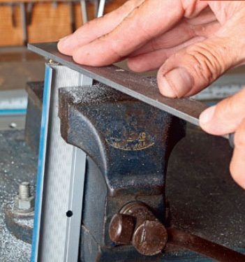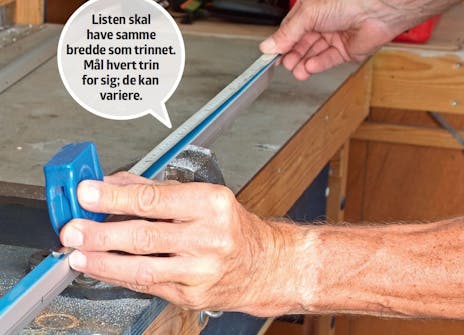 Mål aluminiumslisten op i længder svarende til trinnenes bredde. Spænd listen fast, mens du saver med nedstrygeren.