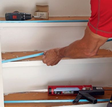 Klæb listerne på. Sørg for, at trinforkanten er renset af, fx med trærens, og klæb så aluminiumslisten på med montagelim.