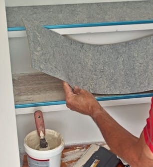 Træk gulvlim på trinnet. Træk limen på med en spartel, så du har et ensartet, tyndt lag. Alulisternes blå plasttape beskytter listerne, så lad den sidde imens.