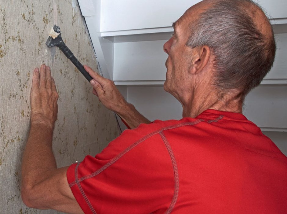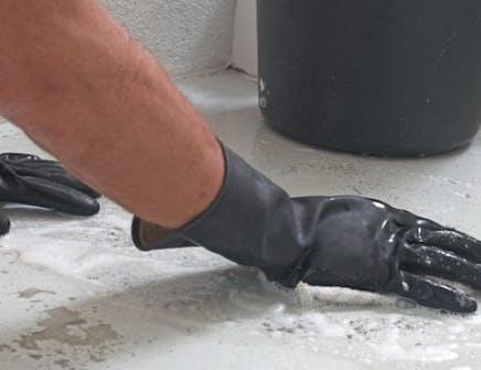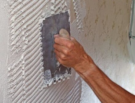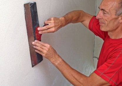 Fjern løst tapet, søm og skruer, lamper, gelænder og andre forhindringer fra de lodrette vægge. En hvid fiberforstærket og klæbende pudsmørtel røres op i en balje efter anvisningen på posen.