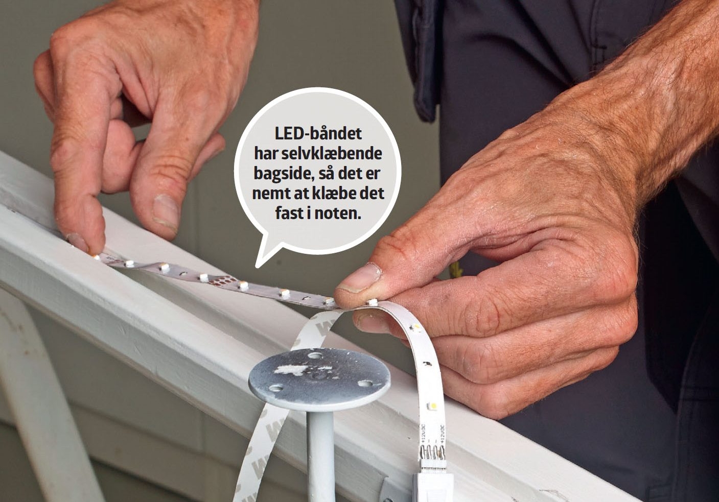 Lysbåndet klæbes fast, når gelænderet er malet hvidt. Tryk den selvklæbende strimmel af lysdioder fast i bunden af noten. Start fra en ende af, og kort lysbåndet af, så det passer i længden.