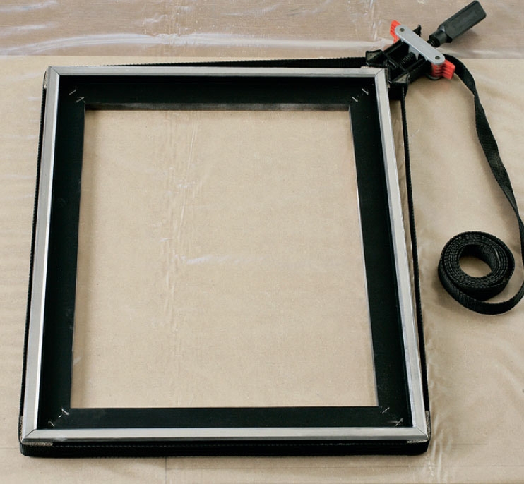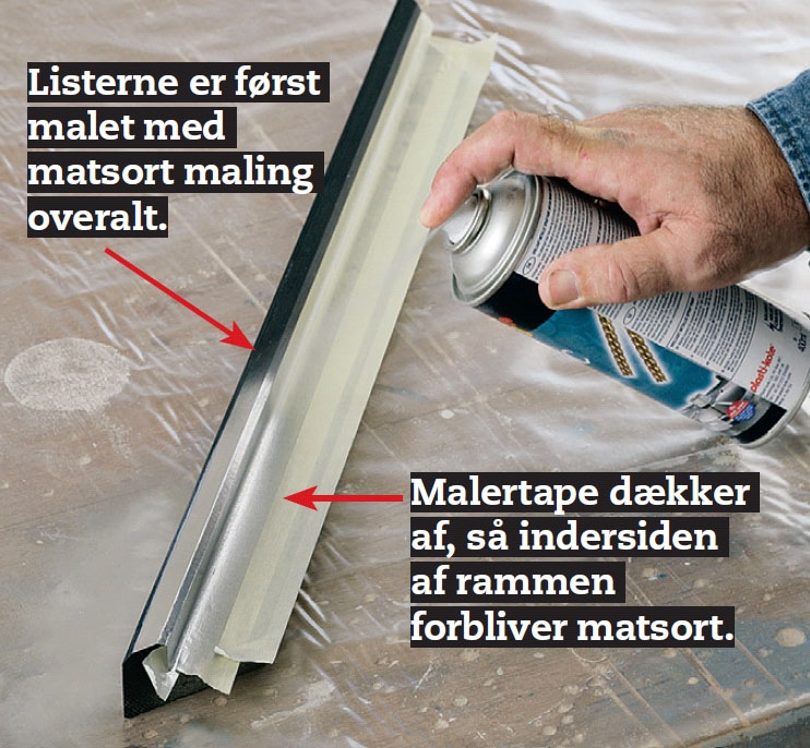 Spraymal rammelisterne. Spray først to gange med matsort, og lad det tørre et døgn. Dæk så af med malertape, og mal ydersiden af rammen med sølvmaling to-tre gange med 10 min.s interval.