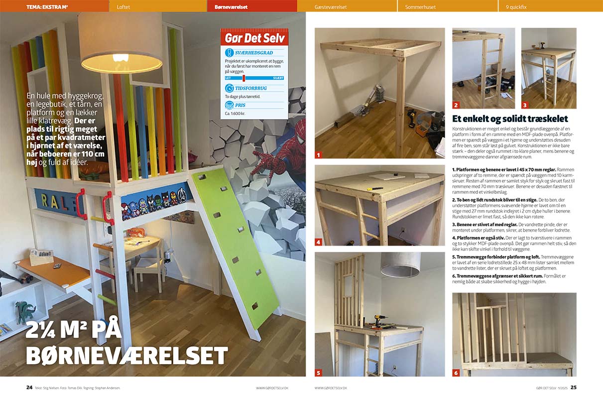 Platformen er spændt på væggen i et hjørne og understøttes desuden af fire ben, som står løst på gulvet. Konstruktionen er ikke bare stærk – den deler også rummet i to klare planer, mens benene og tremmevæggene danner afgrænsede rum.