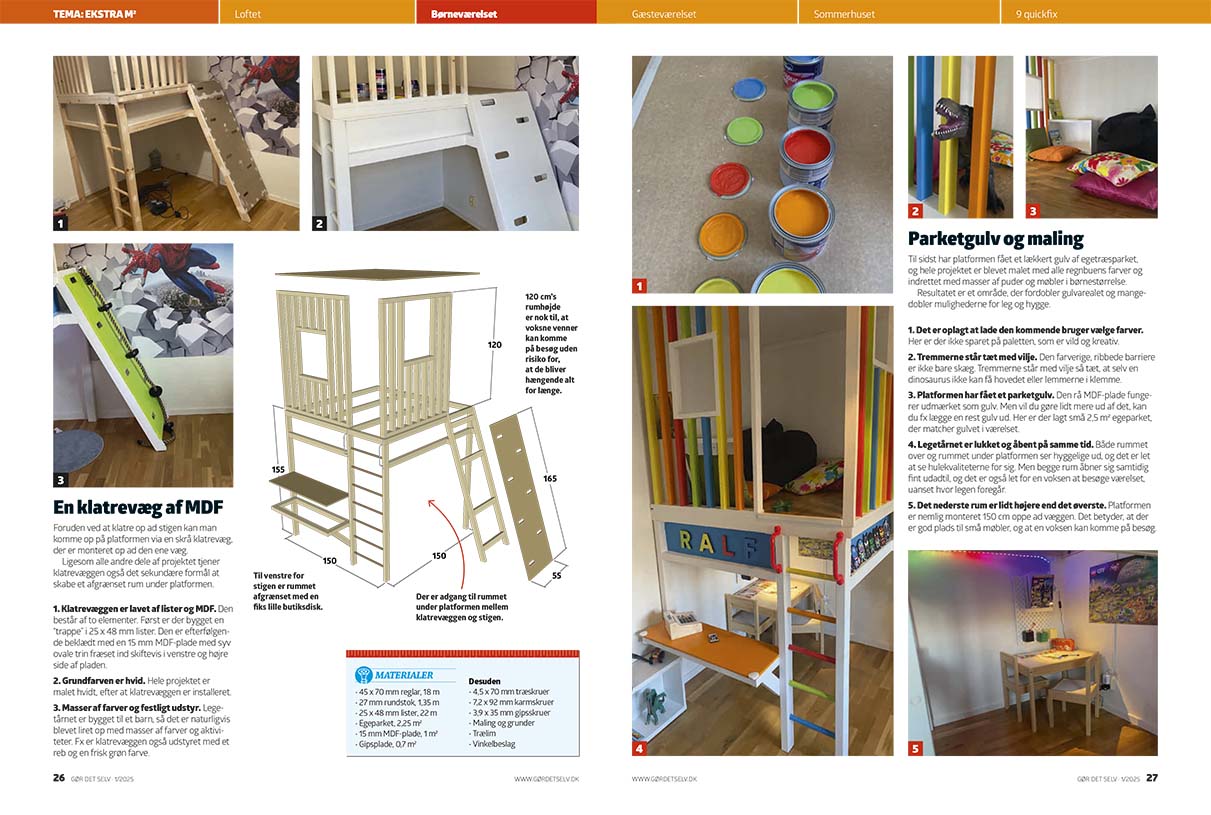 Til sidst har platformen fået et lækkert gulv af egetræsparket, og hele projektet er blevet malet med alle regnbuens farver og indrettet med masser af puder og møbler i børnestørrelse.