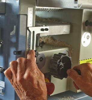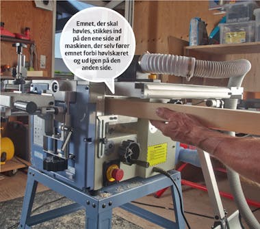 Benytter undersiden af det samme høvlskær, som afretteren bruger. Ved at justere “bordet” kan du bestemme tykkelsen på emnet meget præcist. Høvlen kan fjerne op til 1 mm ad gangen.